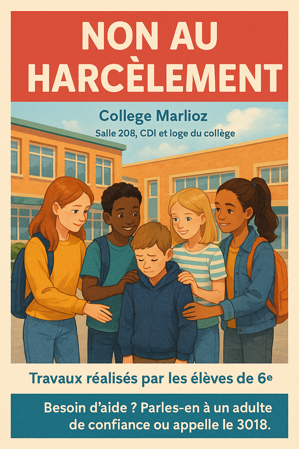 Les élèves de Mme Sani scolarisés en 6B, 6C et 6F ont élaboré des affiches relatives à la lutte contre le harcèlement. Vous les trouverez en pièces jointes.